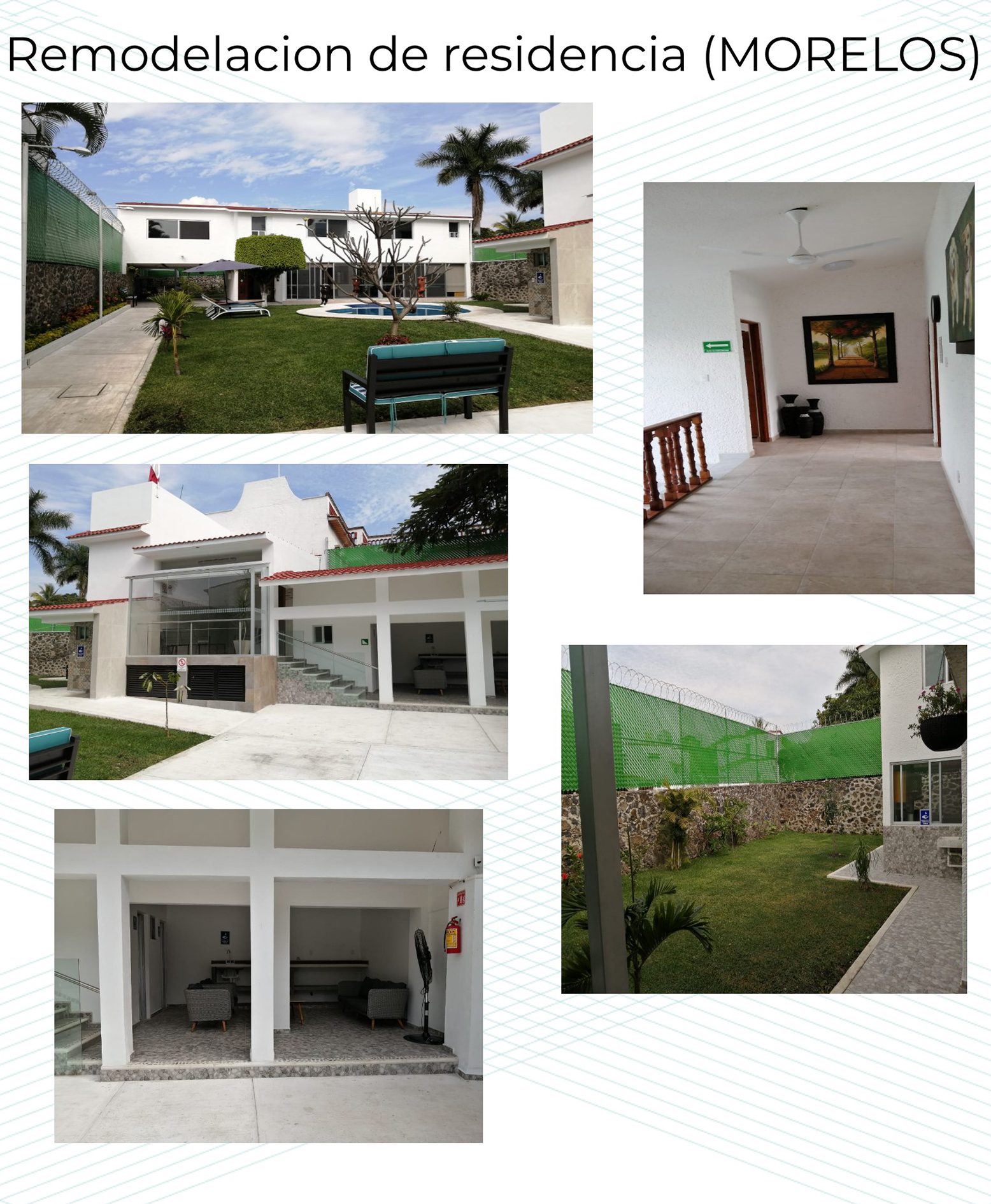 Construccion y Remodelación de area de jacuzzy , de bar , cto. de maquinas, servico ,interiores de casa como cambio de pisos interiores, de baños, alberca ,andadores, estacionamientos, cambio y automatizacion de portones, protecciones de herreria canceleria de aluminio, jardineria , instalaciones electricas, hidrosanitarias, aire acondicionado,camaras de vigilancia etc. Etc.